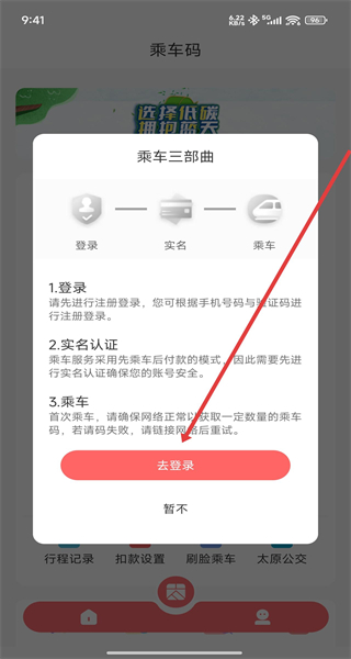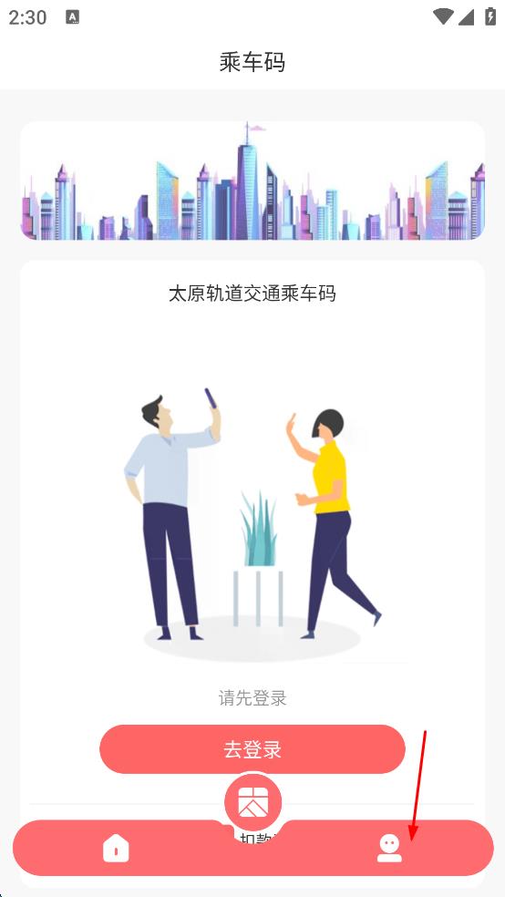 1、打開(kāi)某交通APP,進(jìn)入“乘車(chē)碼”頁(yè)面,看到“請(qǐng)先登錄”提示后,點(diǎn)擊頁(yè)面底部右側(cè)的個(gè)人中心圖標(biāo),進(jìn)入個(gè)人中心頁(yè)面。