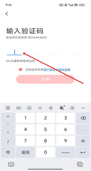 4、在驗(yàn)證碼輸入界面,輸入收到的短信驗(yàn)證碼后,點(diǎn)擊注冊(cè)按鈕,完成賬號(hào)注冊(cè)登錄操作。