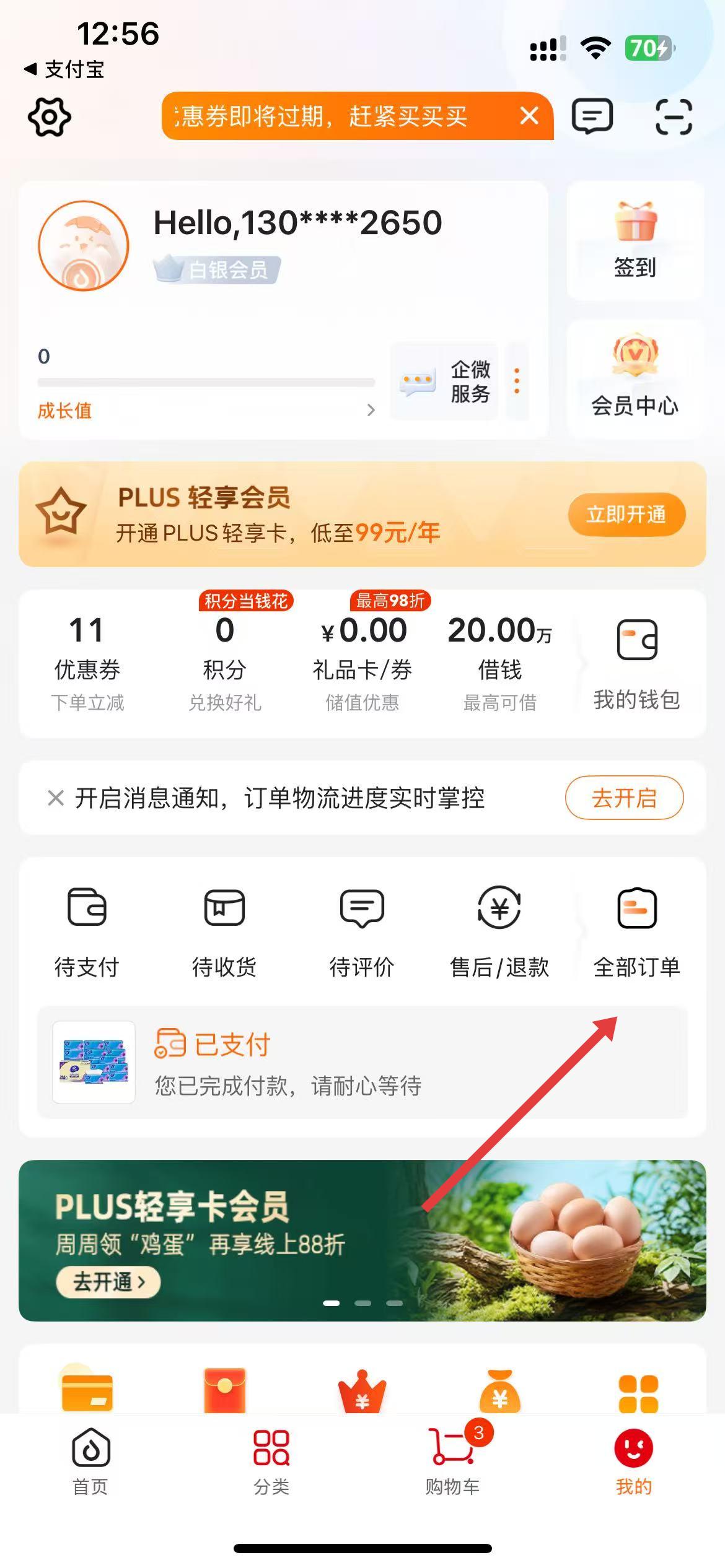 1、打開多點(diǎn)購物app,點(diǎn)擊底部導(dǎo)航欄中我的選項(xiàng),進(jìn)入個(gè)人頁面,在該頁面中找到全部訂單板塊,點(diǎn)擊進(jìn)入訂單列表。