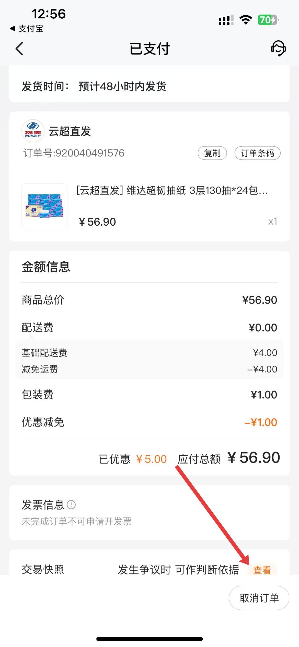 2、找到需要取消的訂單,在訂單詳情頁面,向下滑動(dòng)界面,找到取消訂單按鈕,點(diǎn)擊該按鈕。