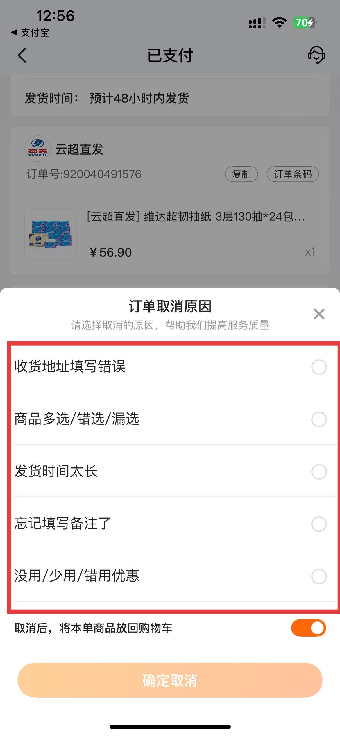 3、點(diǎn)擊取消訂單后,會(huì)彈出訂單取消原因選擇窗口,根據(jù)自身實(shí)際情況選擇一個(gè)原因,勾選后點(diǎn)擊確定取消即可完成訂單取消操作。