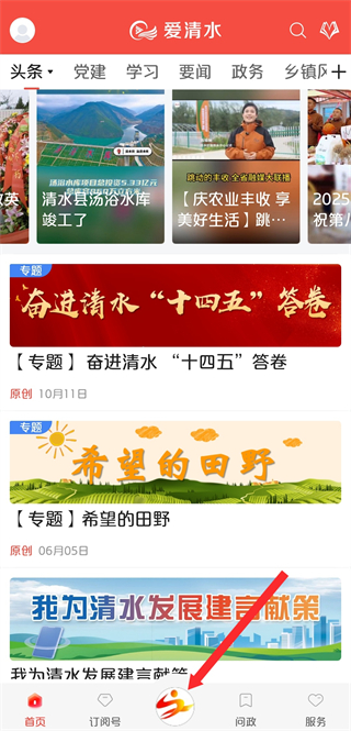 1、在首頁點(diǎn)擊底部中間功能入口,進(jìn)入新時代文明實(shí)踐云平臺頁面。