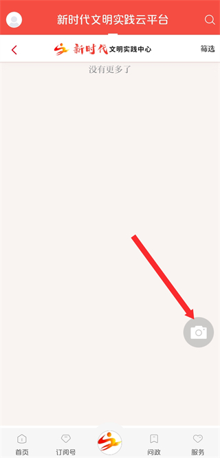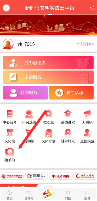 2、在新時代文明實(shí)踐云平臺頁面,點(diǎn)擊隨手拍功能入口,進(jìn)入隨手拍頁面。
