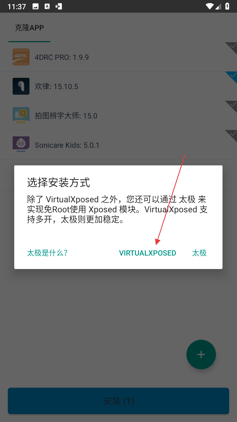 4、在選擇安裝方式對話框中,選擇VIRTUALXPOSED,即可將應用添加到VirtualXposed的虛擬環(huán)境中。