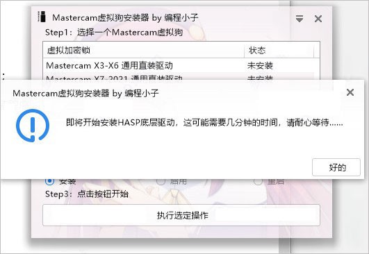 第二步:雙擊運行“Mastercam Virtural Key Installer.exe”程序,選擇X7-2021直裝驅(qū)動(2022可用),選擇安裝, 點擊執(zhí)行選定操作;