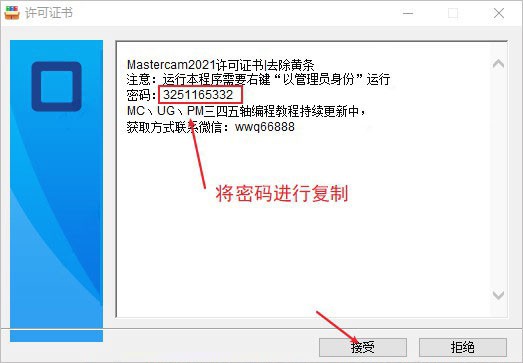 第三步:以管理員的身份運行Mastercam去除黃條 右鍵以管理員身份運行.exe程序,將密碼復制下來,點擊接受;