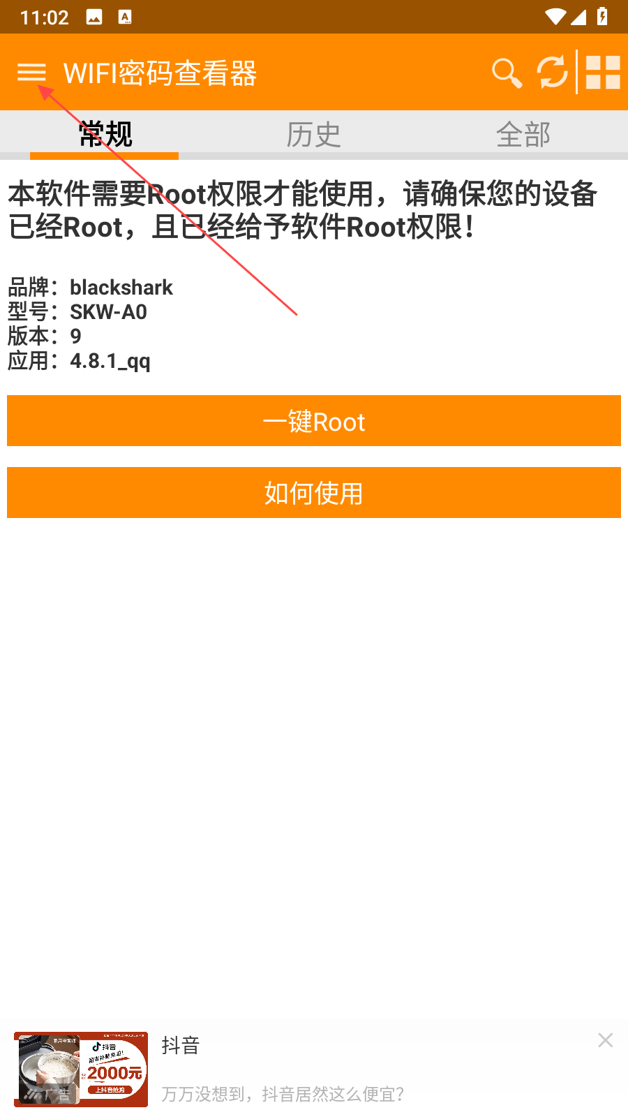 1、打開(kāi)WIFI密碼查看器軟件,點(diǎn)擊界面左上角的三條橫線菜單圖標(biāo),打開(kāi)軟件側(cè)邊菜單。