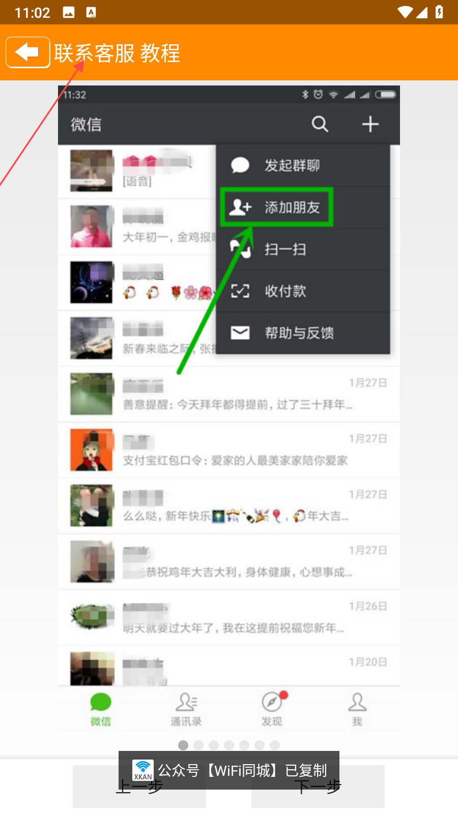3、在聯(lián)系客服教程頁(yè)面,按照提示操作,打開(kāi)微信,點(diǎn)擊添加朋友,通過(guò)查找指定公眾號(hào),關(guān)注相關(guān)公眾號(hào)獲取客服聯(lián)系方式。