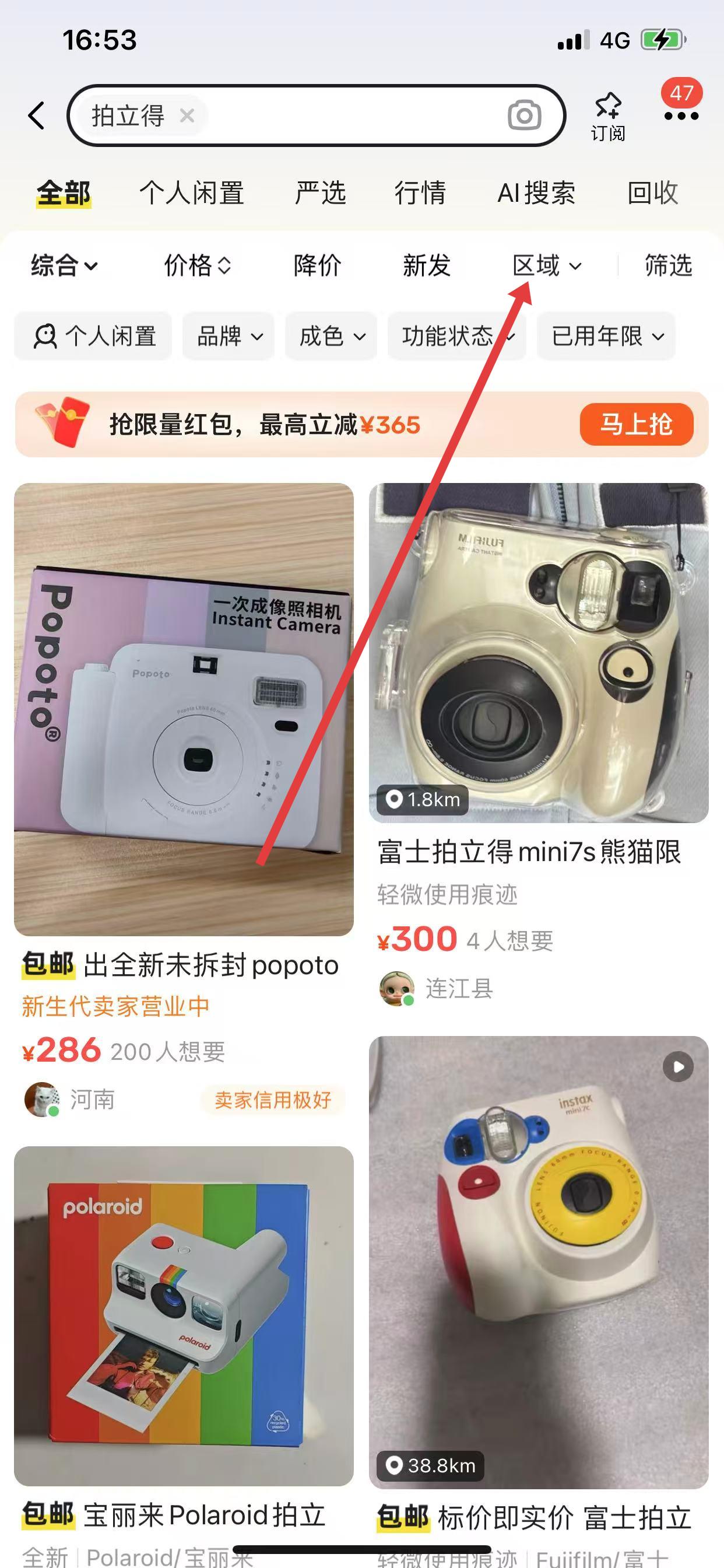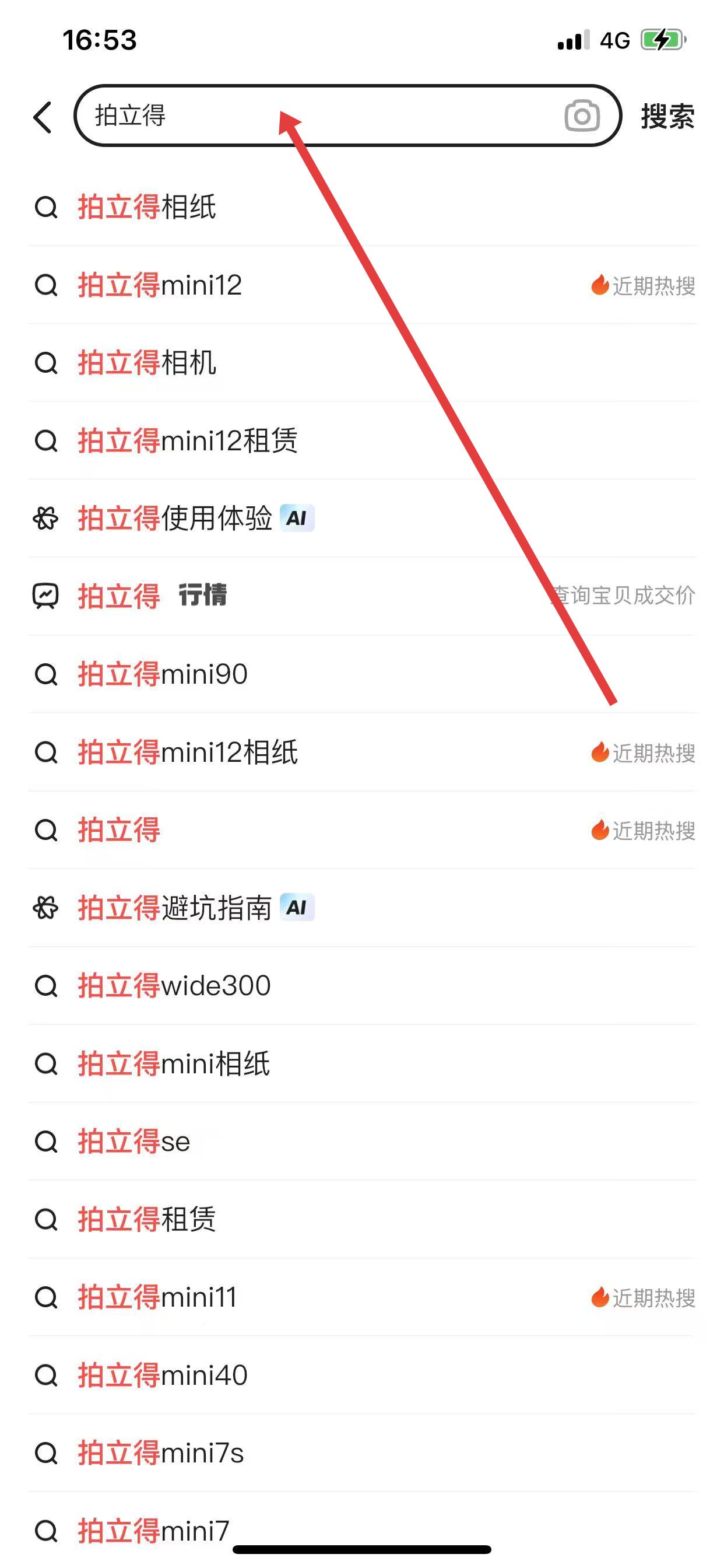 1、打開閑魚APP,在首頁(yè)頂部的搜索欄中,輸入想要購(gòu)買的商品關(guān)鍵詞,如“拍立得”,然后點(diǎn)擊搜索按鈕。