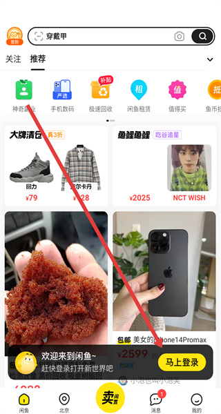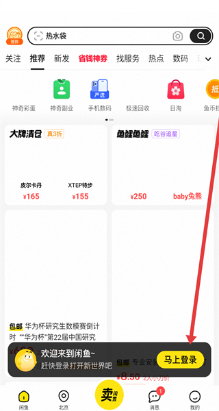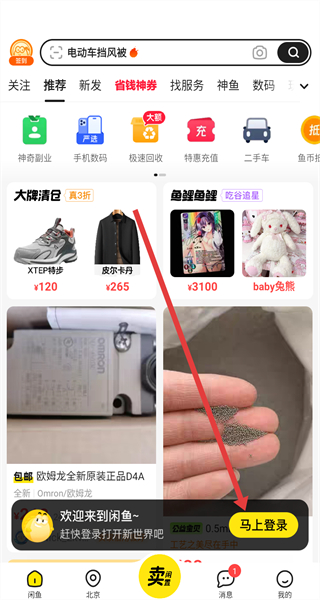 1、在進(jìn)入到閑魚首頁(yè)中,可以點(diǎn)擊下方馬上登錄按鈕,進(jìn)行登錄操作。