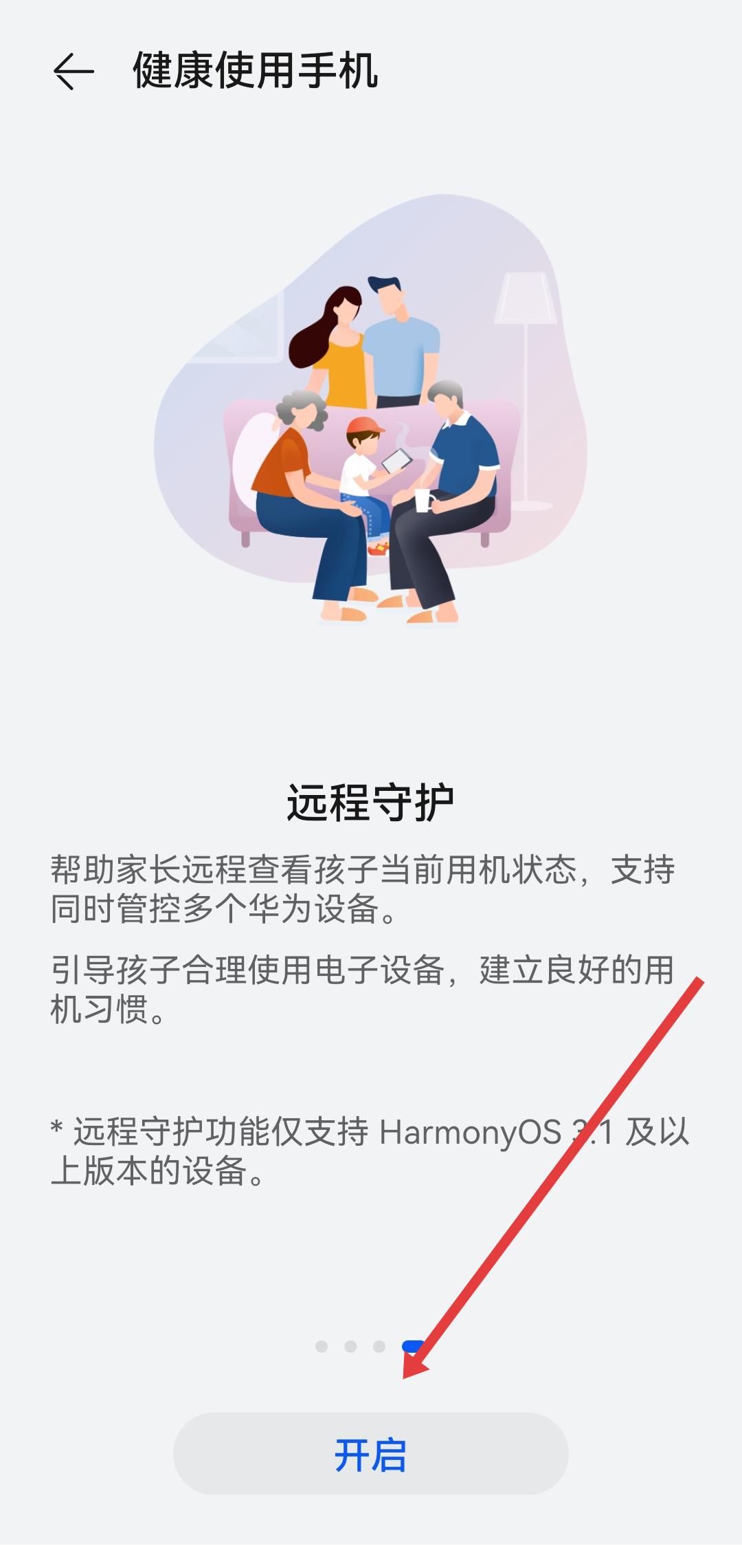 3、在健康使用手機的頁面,點擊開啟的按鈕,進入使用者選擇流程。