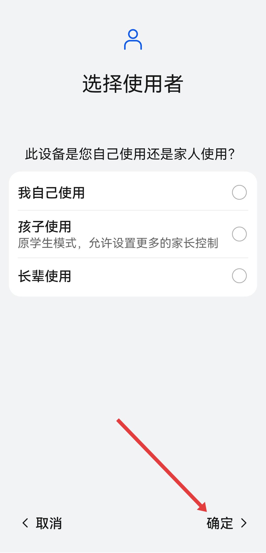 4、在選擇使用者頁面,選擇孩子使用選項,點擊右下角確定按鈕,即可完成防沉迷設(shè)置。
