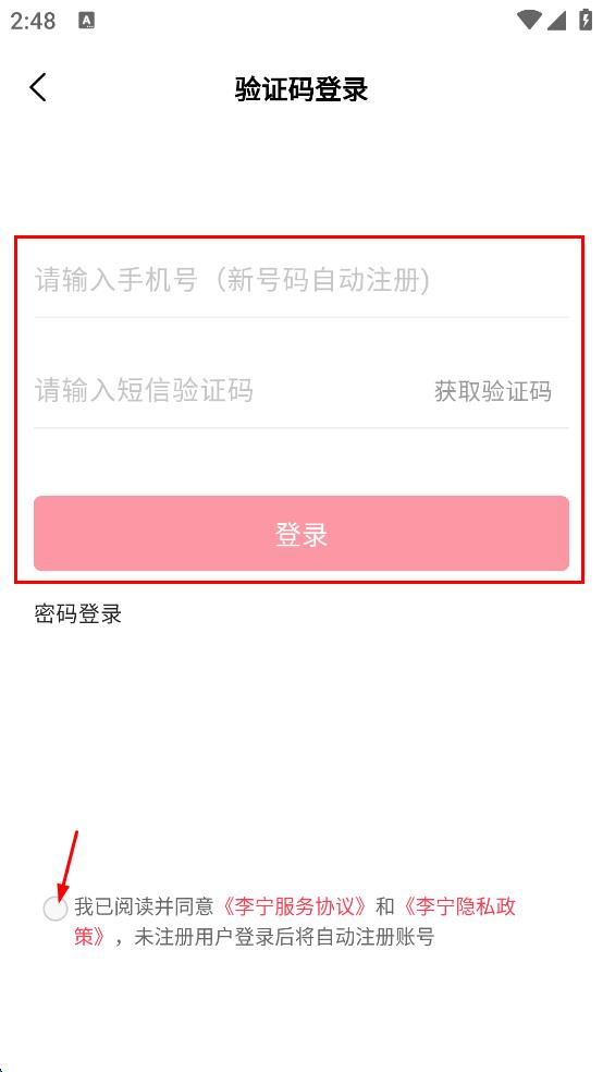 4、在登錄界面,選擇驗證碼登錄,輸入手機號,獲取并填寫短信驗證碼,勾選相關協(xié)議后點擊登錄按鈕。