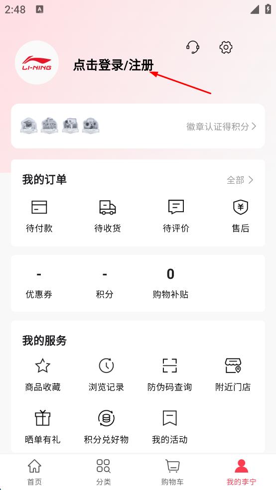 3、在我的李寧頁面,點擊登錄/注冊區(qū)域,進入登錄界面。