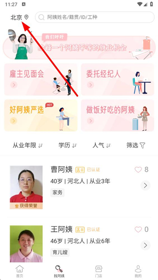 1、在首頁界面,點擊底部找阿姨選項,進入對應(yīng)的服務(wù)頁面。