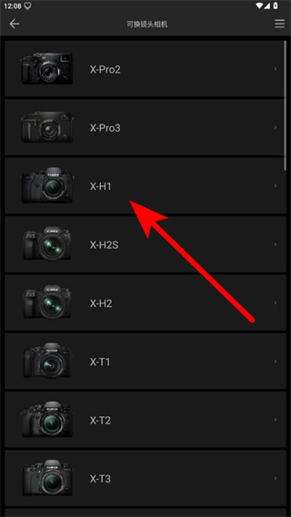 3、在可換鏡頭相機(jī)列表中,選擇與自己相機(jī)對(duì)應(yīng)的型號(hào),比如X-H1。