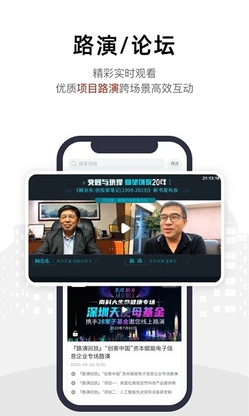 2、通過(guò)路演帶你找到好項(xiàng)目,好機(jī)會(huì),各種機(jī)構(gòu)信息一鍵了解!可以與其他用戶(hù)進(jìn)行經(jīng)驗(yàn)交流。