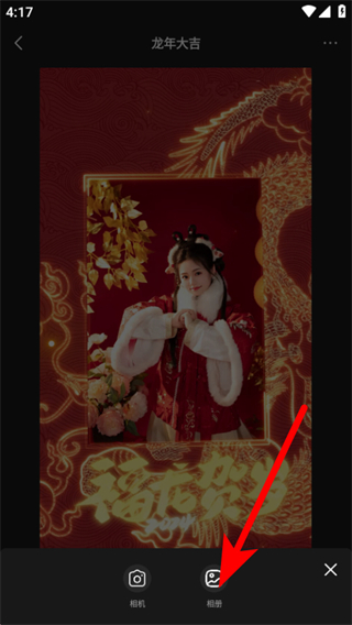 4、選擇相冊按鈕,從手機相冊中選取照片,即可將照片與模板融合,生成創(chuàng)意效果。