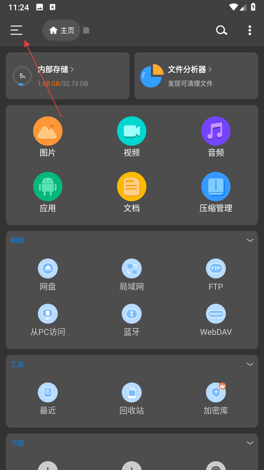 1、打開RS文件瀏覽器,點擊左上角三條橫線圖標,展開側邊欄菜單。