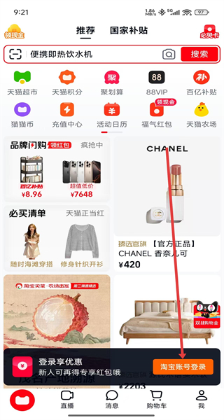 2、在進入到天貓首頁中,可以點擊下方淘寶賬號登錄按鈕,準備開始登錄操作。