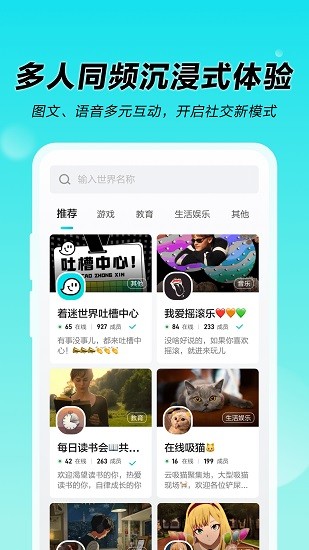 著迷世界為你打造不一樣的社交平臺(tái),在這里每個(gè)人可以單獨(dú)創(chuàng)建自己的世界,世界里的一切規(guī)則由你制定。你可以邀請(qǐng)自己好友或者開(kāi)放別人加入,多人同屏交流,無(wú)論是發(fā)布圖文還是語(yǔ)音等都是可以的,你還可以發(fā)布各種話題來(lái)討論。歡迎有需要的朋友下載使用!
