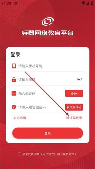1、打開兵器網(wǎng)絡(luò)教育平臺app,找到并點擊驗證碼登錄選項。