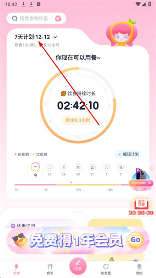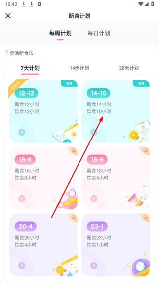 2、在斷食計劃頁面,選擇想要重新制定的計劃類型,如7天計劃中的14-10。