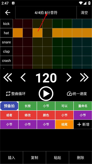 個(gè)人或樂(lè)隊(duì)在演奏樂(lè)器時(shí),本app可以充當(dāng)鼓手的作用。新建“整曲節(jié)奏”,點(diǎn)擊網(wǎng)格添加鼓點(diǎn)音符,即可按順序播放或循環(huán)播放。