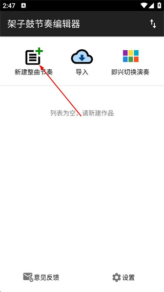 1、打開(kāi)架子鼓節(jié)奏編輯器,點(diǎn)擊新建整曲節(jié)奏,進(jìn)入節(jié)奏編輯頁(yè)面。
