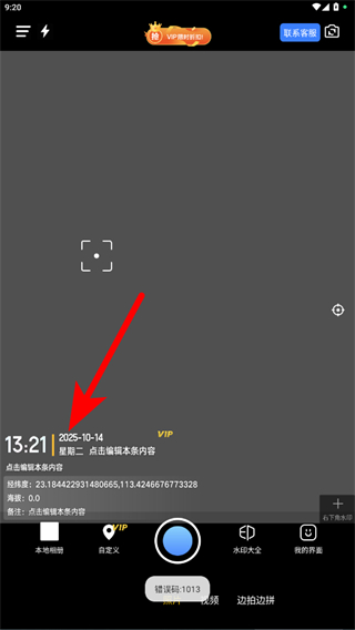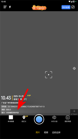 1、打開搞定水印相機(jī)APP,在拍攝界面點(diǎn)擊下方顯示的時(shí)間區(qū)域,進(jìn)入水印編輯頁面。