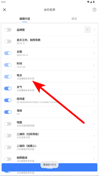2、在水印編輯頁面中,找到并點(diǎn)擊地點(diǎn)選項(xiàng)。