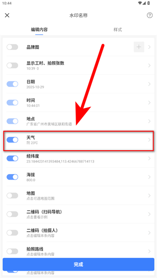3、水印樣式可以自己挑選,可以添加時(shí)間、地點(diǎn)、天氣和經(jīng)緯度水印。