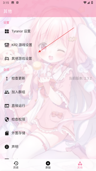 1、打開(kāi)Tyranor模擬器應(yīng)用,點(diǎn)擊其他頁(yè)面里的其他設(shè)置選項(xiàng),進(jìn)入其他游戲設(shè)置界面。