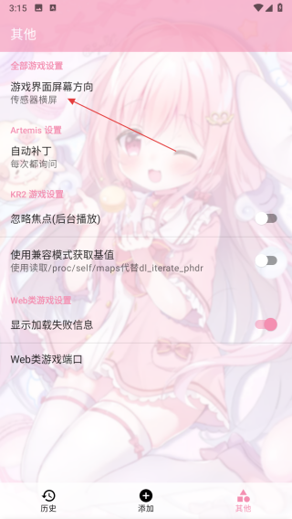 2、進(jìn)入其他游戲設(shè)置界面,能看到游戲界面屏幕方向這個(gè)設(shè)置選項(xiàng),點(diǎn)擊游戲界面屏幕方向選項(xiàng)。