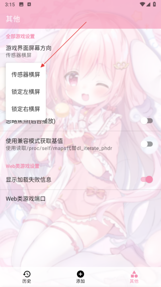 3、在彈出的菜單里挑選傳感器橫屏,鎖定左橫屏或者鎖定右橫屏,設(shè)置游戲運(yùn)行時(shí)的屏幕方向。
