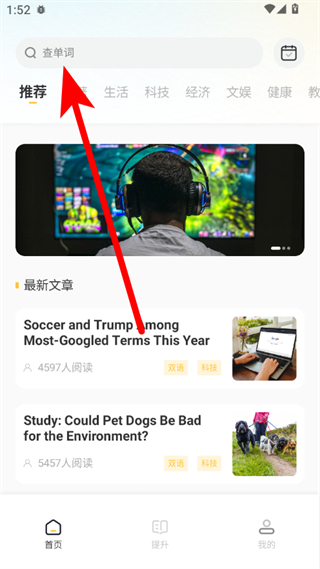 1、在應(yīng)用首頁,點擊查單詞搜索框,進入翻譯界面。