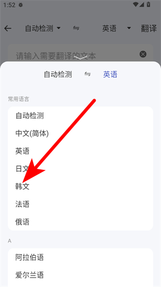 3、在語言列表中,選擇目標翻譯語言,如韓文。