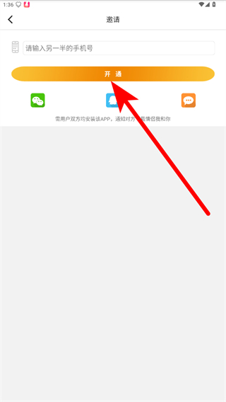 4、在邀請(qǐng)頁(yè)面,輸入對(duì)方的手機(jī)號(hào),然后點(diǎn)擊開(kāi)通,等待對(duì)方接受邀請(qǐng)并完成相應(yīng)操作,即可成功綁定情侶關(guān)系。