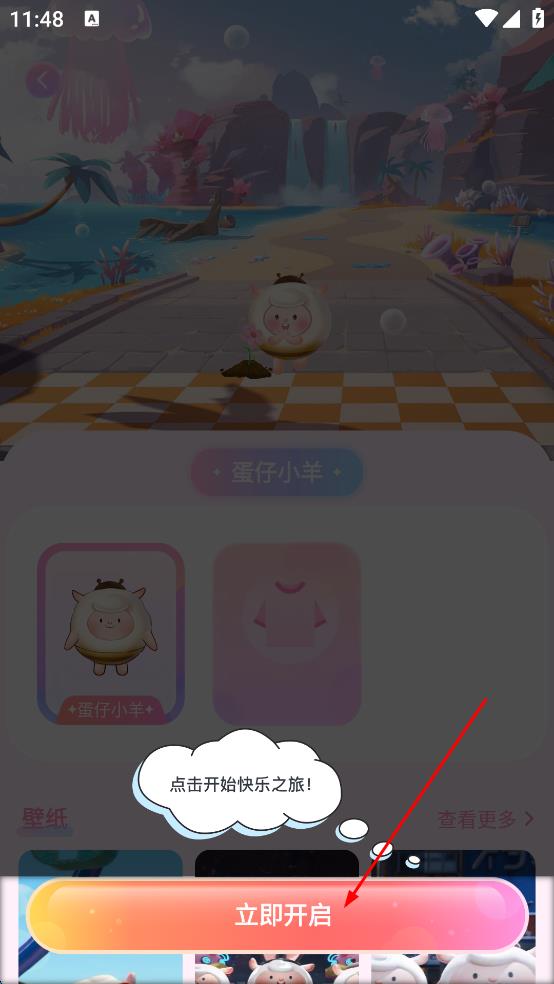 3、在蛋仔小羊頁面,點(diǎn)擊下方“立即開啟”按鈕,即可啟動(dòng)與該寵物相關(guān)的互動(dòng)旅程,開啟快樂體驗(yàn) 。