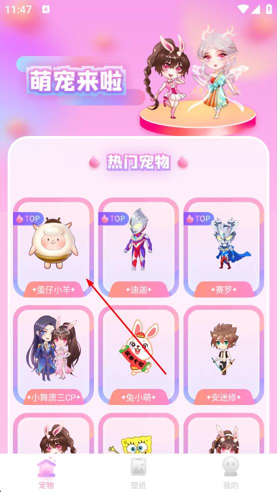 2、登錄后進(jìn)入寵物界面,在熱門寵物列表找到“蛋仔小羊”,點(diǎn)擊該寵物圖標(biāo),進(jìn)入其專屬頁面 。