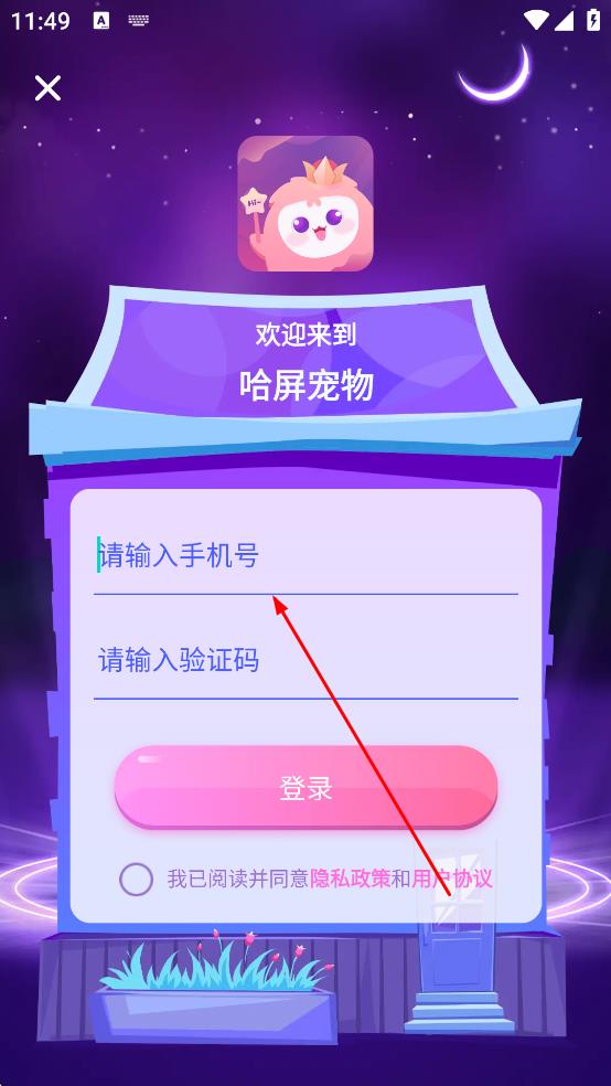 1、進(jìn)入哈屏寵物登錄界面,在“請(qǐng)輸入手機(jī)號(hào)”欄填寫手機(jī)號(hào)碼,接著輸入對(duì)應(yīng)驗(yàn)證碼,勾選同意協(xié)議后點(diǎn)擊登錄 。