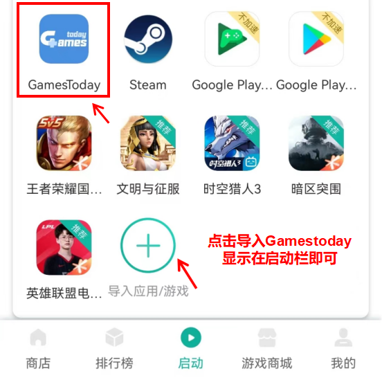2、下載完成之后,在OurPlay加速器中導入該軟件,不要直接打開GamesToday,要導入OurPlay中;