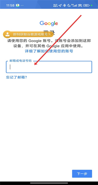 2、跳轉(zhuǎn)到谷歌登錄頁面后,可以點擊輸入框填寫谷歌郵箱后點擊下一步按鈕。