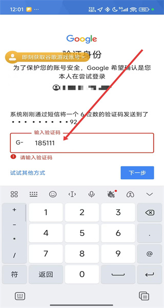 4、在獲取到驗證碼后,可以點擊輸入框填寫,填寫好后點擊下一步即可完成登錄。