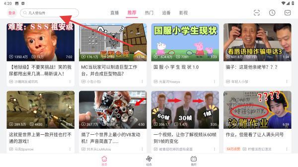 1、進(jìn)入主頁面:打開嗶哩嗶哩APP,點(diǎn)擊底部導(dǎo)航欄最左側(cè)的推薦圖標(biāo),進(jìn)入主頁面頂部中間可見搜索欄。