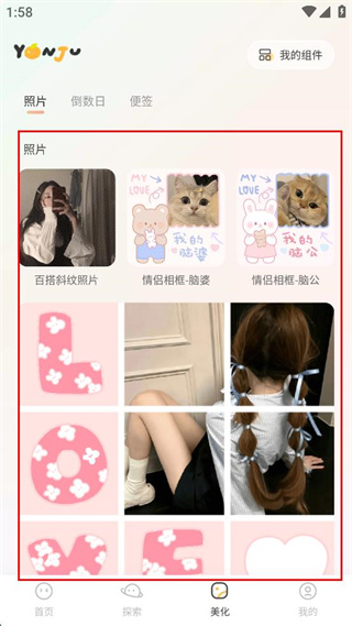 4、登錄成功后,進(jìn)入美化頁面查看各類照片美化素材,如百搭斜紋照片、情侶相框等。