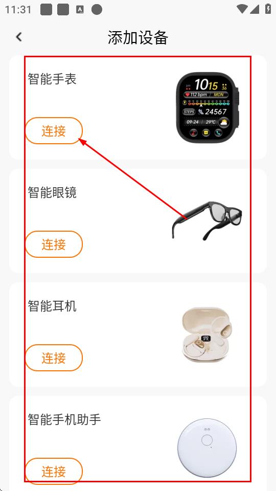 3、進(jìn)入添加設(shè)備頁面后,選擇你要添加的設(shè)備類型,如智能手表,點(diǎn)擊連接按鈕。