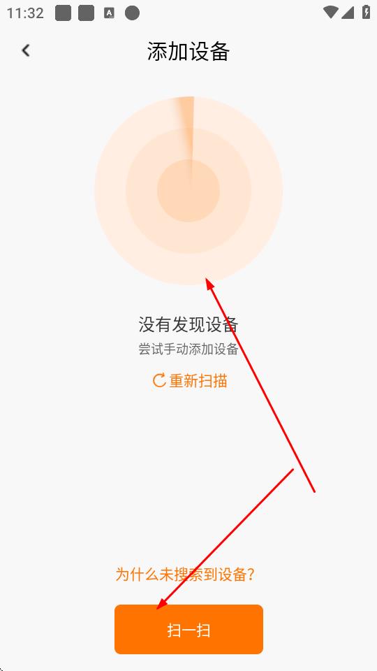 4、如果應(yīng)用沒有自動(dòng)搜索到設(shè)備,點(diǎn)擊頁面下方的掃一掃按鈕。