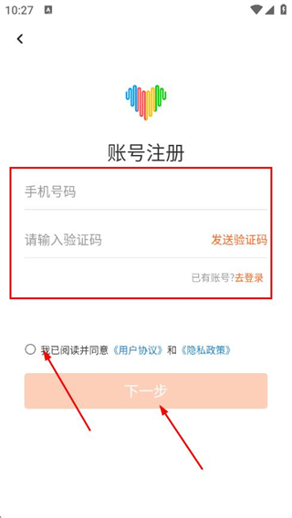 2、在賬號(hào)注冊(cè)頁面輸入手機(jī)號(hào)碼,輸>入驗(yàn)證碼,勾選協(xié)議,點(diǎn)擊下一步。