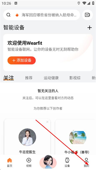 1、打開Wearfitpro應(yīng)用,進(jìn)入首頁,點(diǎn)擊底部導(dǎo)航欄中的設(shè)備選項(xiàng)。